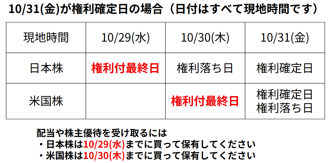 10月の日本株の場合は、10/29(水)が権利付最終日で、10/30(木)が権利落ち日になります。