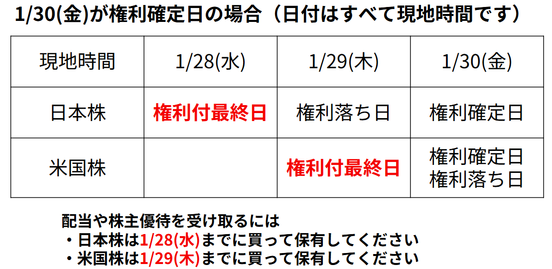 1月の日本株の場合は、1/28(水)が権利付最終日で、1/29(木)が権利落ち日になります。米国株は日本株のように月末が権利落ち日というわけではなく、企業によりバラバラですのでご注意ください。