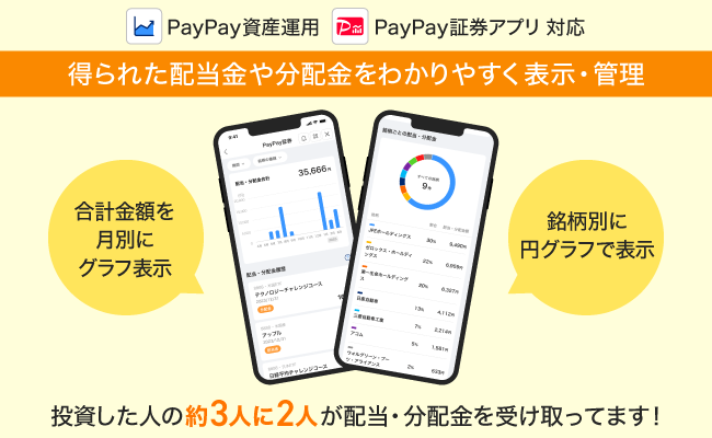 また、PayPay証券で投資された方のうち、約3人に2人が受け取っている配当金・分配金を、アプリ上から月別や銘柄別でグラフでわかりやすく、簡単に確認できます。