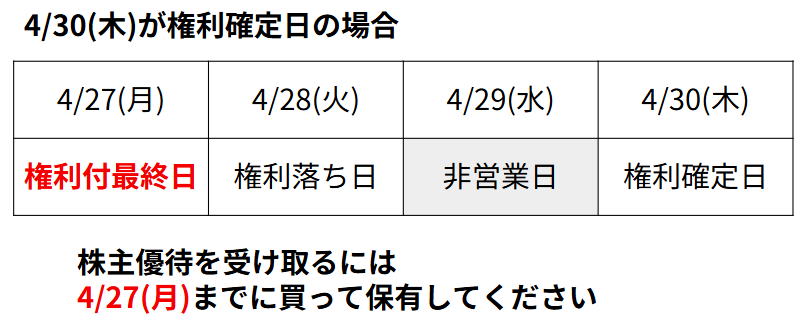 この日までに株を買って保有すると、株主優待をもらう権利が得られます。投資家にとって最も重要な日です。この日までに売ってしまうと権利は得られません。